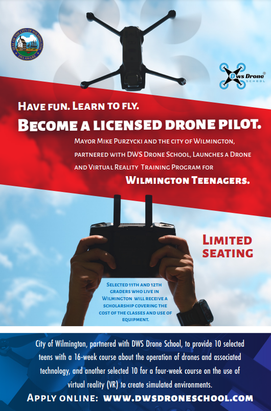 Mayor Mike Purzycki and Parks and Recreation Director Ian Smith today announced details of two City-supported training and career programs for high school juniors and seniors. The City has partnered with the Drone Workforce Solutions (DWS) Drone School owned by local attorney and entrepreneur Theo Nix, Jr., to provide a 16-week training course about the operation of drones and associated drone technology, and a four-week course on the use of virtual reality (VR) computer technology to create simulated environments. These fields of study are growing rapidly in popularity and open new avenues for a young person’s career development.